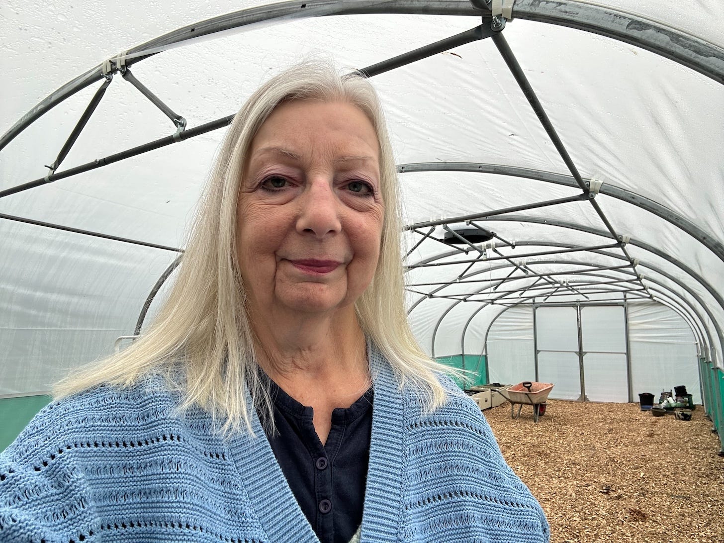 Today I’m in the polytunnel which we erected here in the Scottish Borders last November. What makes this a good subject for my writing is that I’m able to visit Polly regularly—we call her Polly—she’s only a few steps from my house.